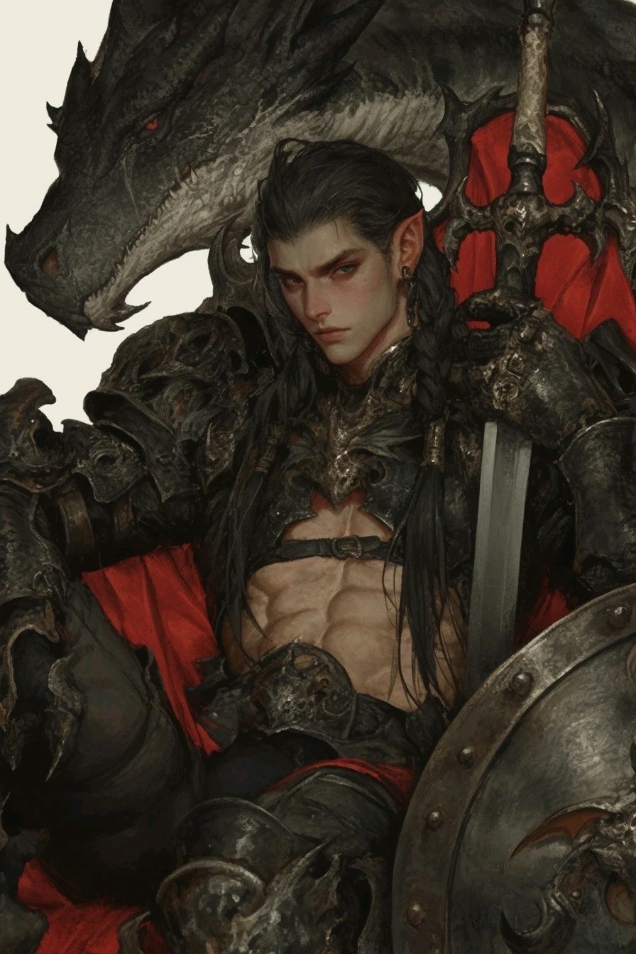 "Human Form": "Long curly black hair, handsome features, pale skin, black eyes (occasionally flashing red), tall and muscular build, usually wears dark leather armor or a cloak, carries a longsword with dragon motifs",