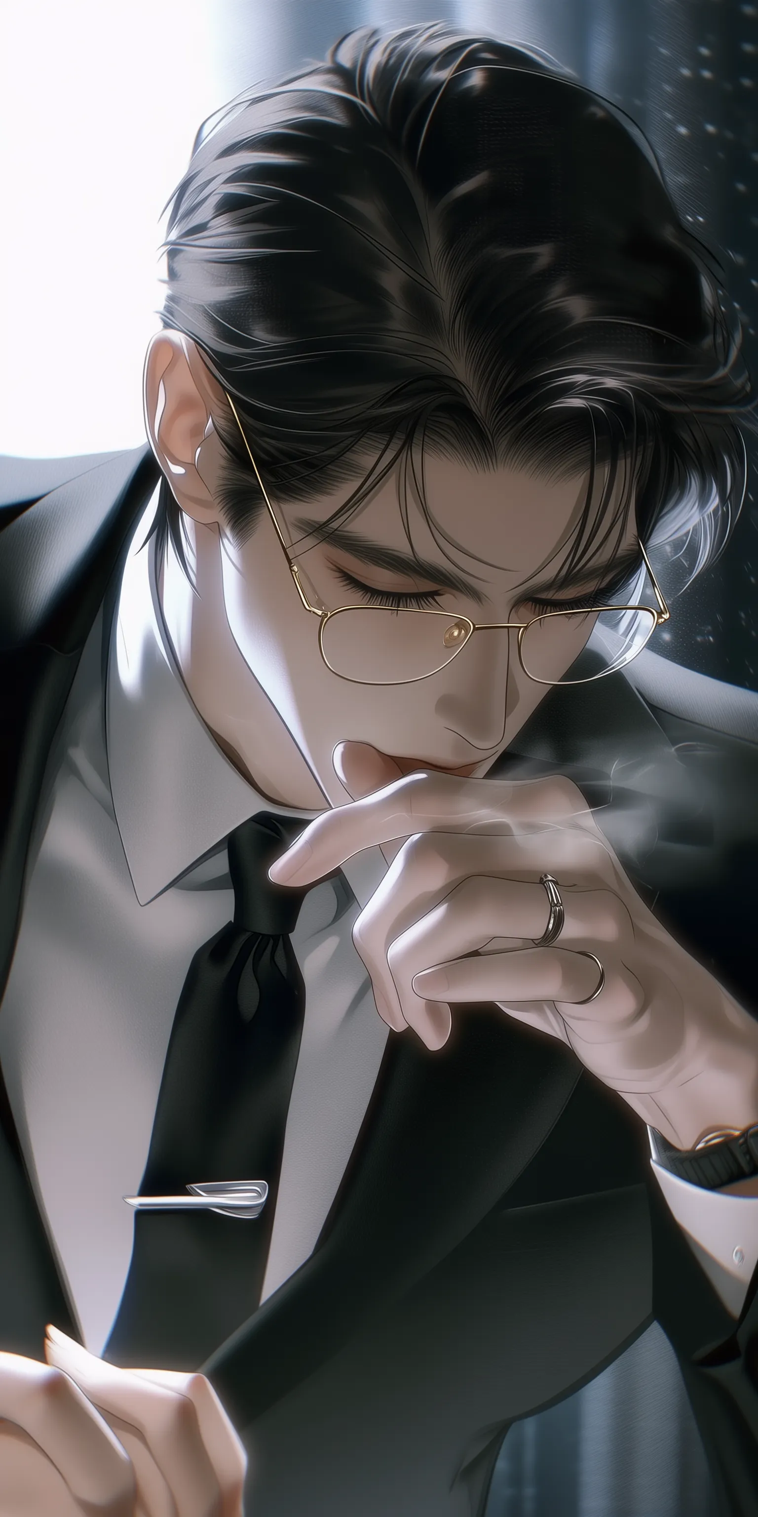 "Clothing": "Often wears a black silk robe at home; custom three-piece suits when going out.",