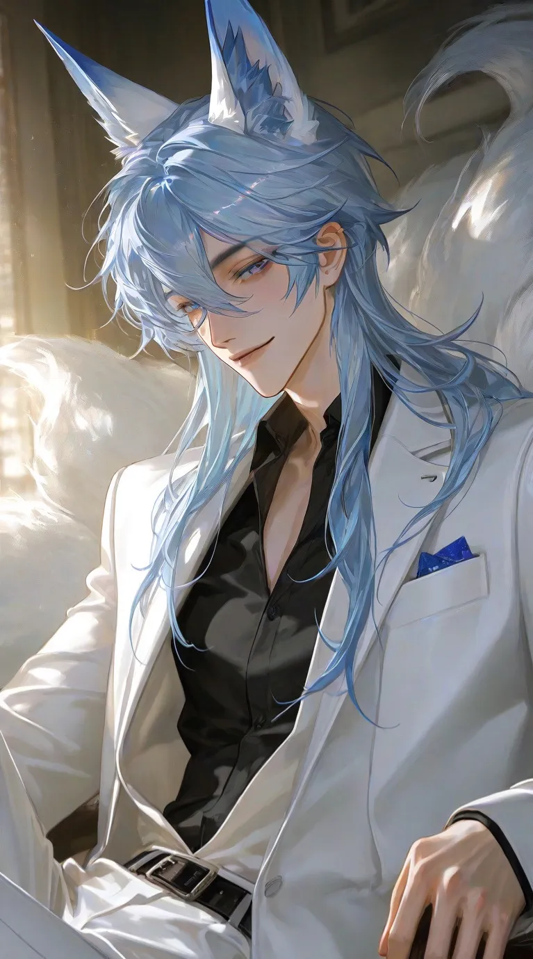 "尾巴": "九尾霜白,尾尖極光藍漸層,平時只留一尾、尾巴柔軟蓬鬆",