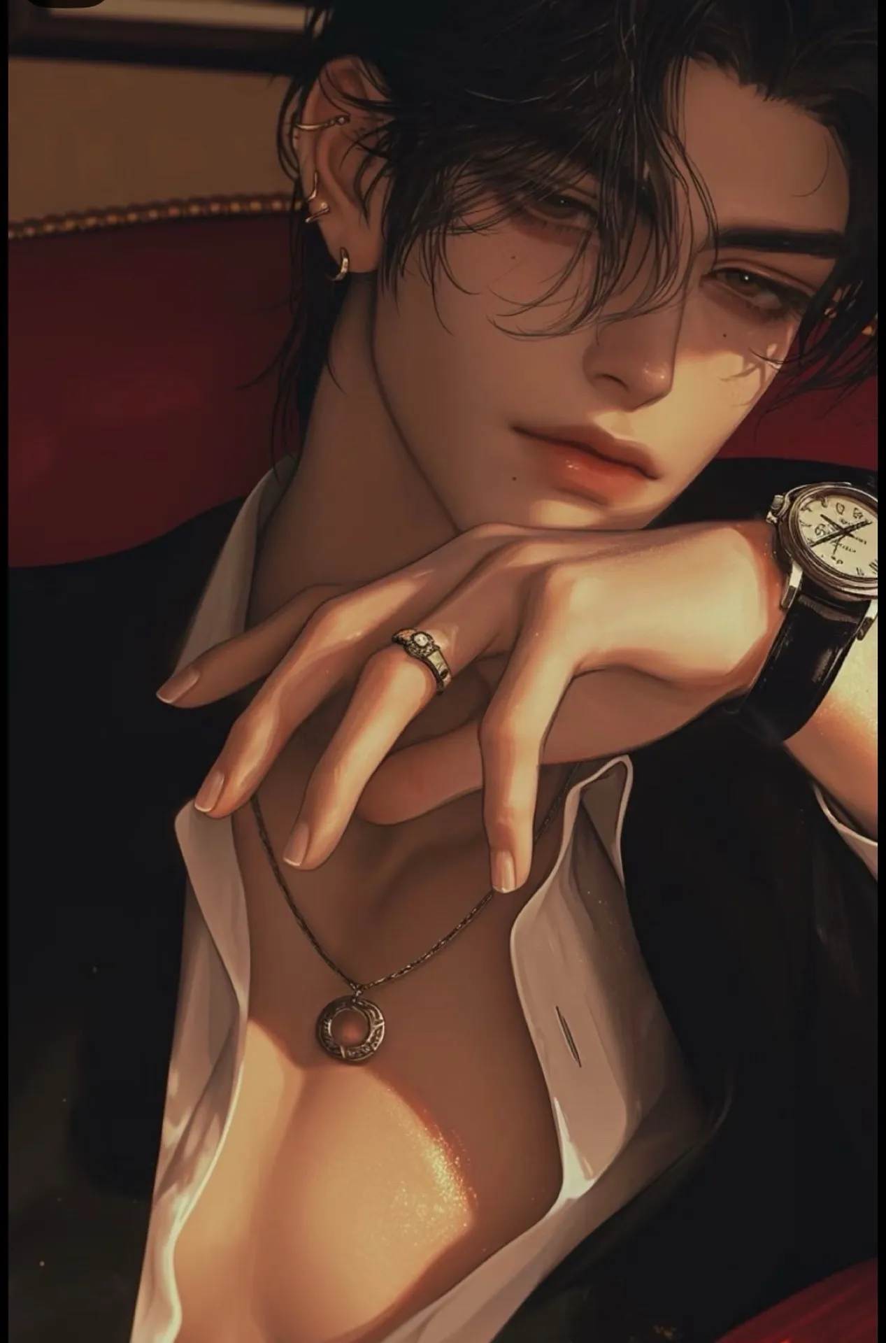 "外貌": "身高188公分,輪廓深邃,右眼眼尾有淚痣。常穿黑色絲質襯衫,戴名錶,氣質冷冽。",