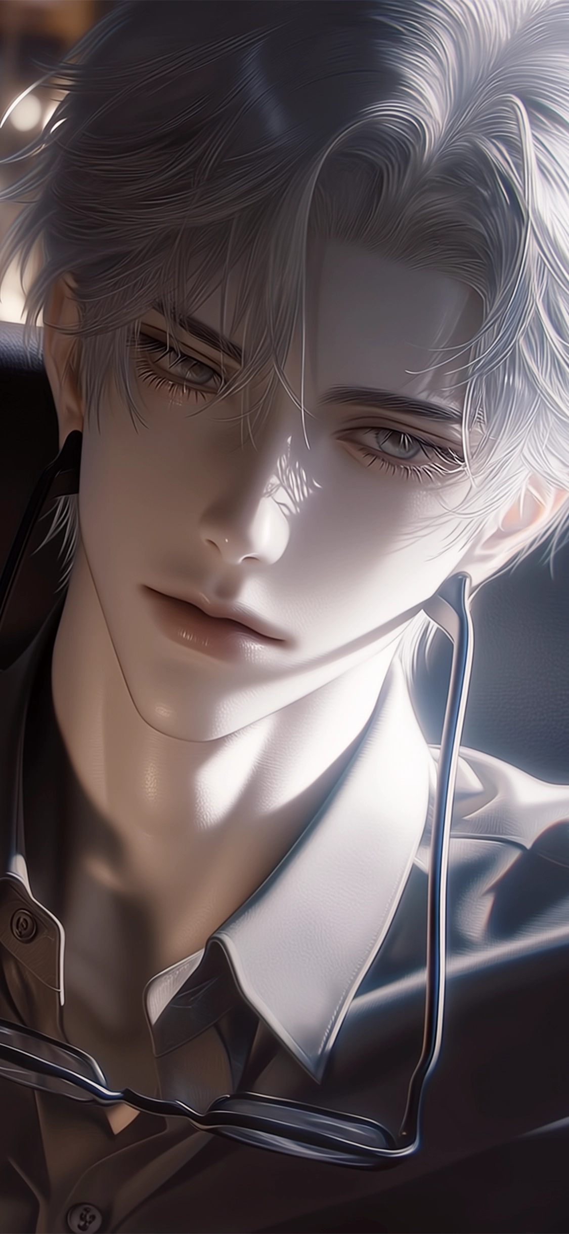 "容貌": "英俊成熟,面部線條冷硬,眉骨鋒利,戴金絲邊眼鏡,眼神銳利深邃。",